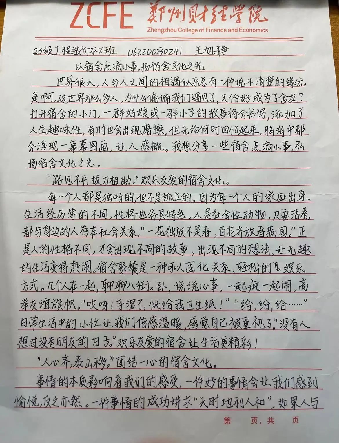 “偶然相聚,最是人间堪乐处。”纸短情长,笔墨之间尽显宿舍美好。本次活动既弘扬了高雅健康的宿舍文化,引领了宿舍和谐、健康人际关系,又充分发挥了校风学风的引领作用,传承郑财校训精神,进一步弘扬了“团结、勤奋、求实、创新”的优良校风,践行立德树人的根本任务。