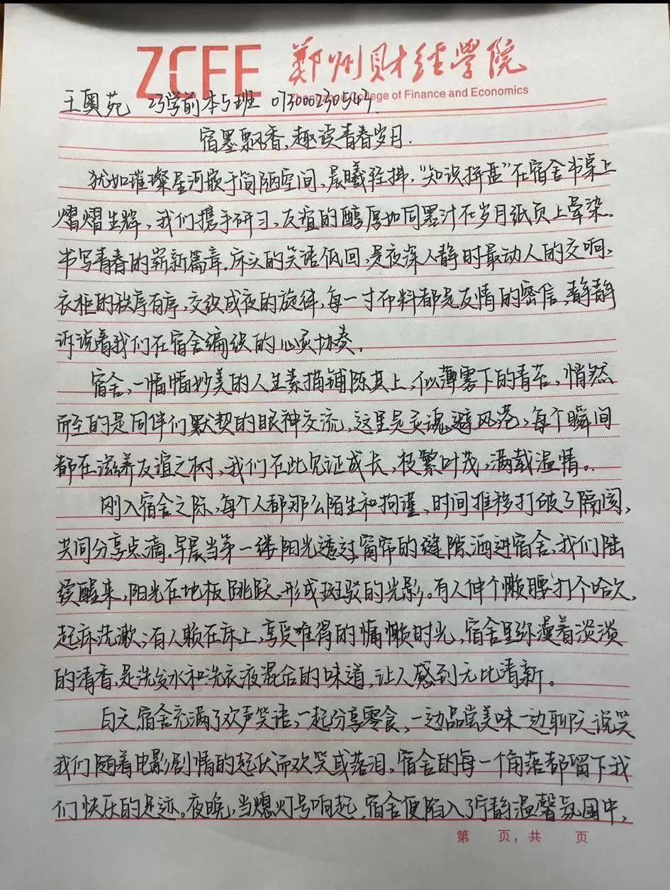 “偶然相聚,最是人间堪乐处。”纸短情长,笔墨之间尽显宿舍美好。本次活动既弘扬了高雅健康的宿舍文化,引领了宿舍和谐、健康人际关系,又充分发挥了校风学风的引领作用,传承郑财校训精神,进一步弘扬了“团结、勤奋、求实、创新”的优良校风,践行立德树人的根本任务。